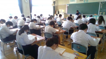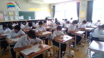 二年生では、夏休みの学習についての確認テストを行っています。本日は理科と国語、明日は残りの三教科を行います。