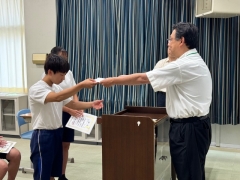 本日、終業式が行われました。まず、これまでの活動の成果として、表彰伝達が行われました。先日の中体連を中心に、良い歯のコンクールなどで素晴らしい成績をいただくことになりました。みなさんの次なる目標が楽しみです。