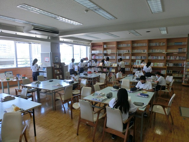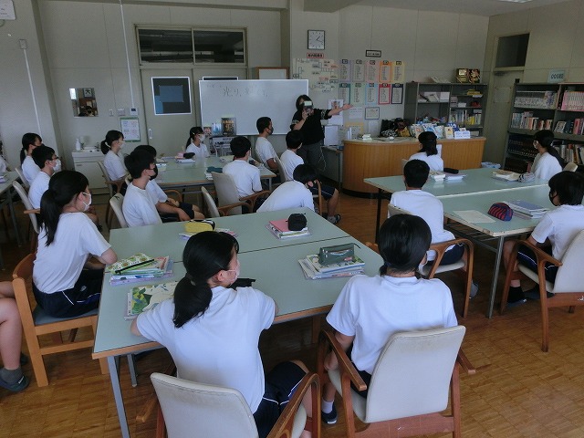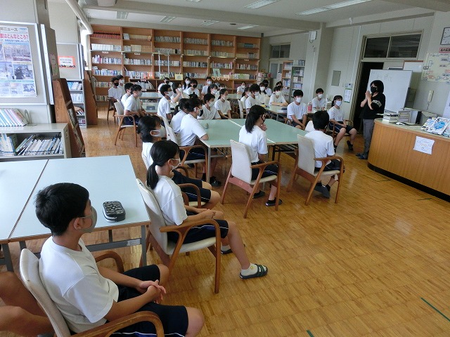 7月13日(火)各クラス、国語の時間に「ブックトーク」を行いました。テーマは「光り、輝く」で、学校司書にたくさんの本を紹介していただきました。夏休みはいつも読まない本やジャンルにも挑戦できる良い期間です。また、そのあとの時間には、読書感想文の本を選び、悩んでいる姿がありました。