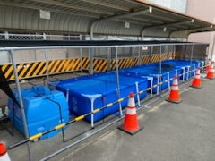 今日は、その引っ越し先となる従来の駐輪場に、鯉の仮設プールが設置されました。カルキ抜きを行って、木曜日に引っ越しです。