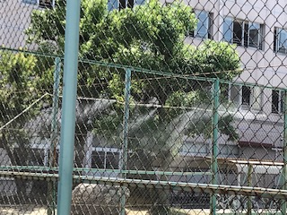 今年もミストシャワーを設置しました。部活動の時に威力を発揮してくれる強い味方です。写真でもわかるぐらい勢いよくミストが噴き出ています。