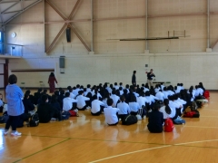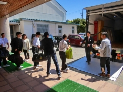 体育館で事前指導や荷物確認等の最終チェックをした後、トラックに荷物を入れました。