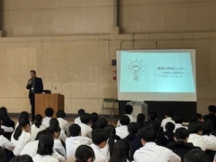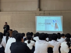 認証式のあとは、校長先生から面白い学校づくりのため、プレゼンタイム! 面白い学校をつくるためには、みなさんがキャストとして活躍する学校を目指していきたい。学校生活の中で知らず知らずのうちに見逃すことがたくさんあります。カラーバス効果を活用して、たくさんの気づきを見つけられるようにしてほしいです。