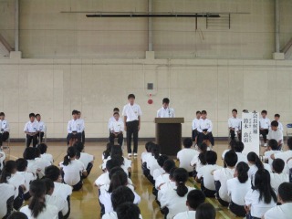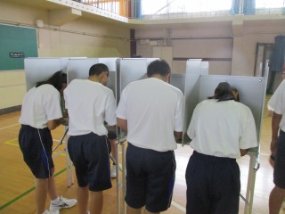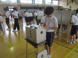 本日6限目に生徒会立候補者立会演説会および投票が行われました。会長と1年女子執行委員が決選投票、あとの候補者は信任投票でした。どの候補者、応援演説者も争点がはっきりしており、分かりやすく主張する姿が大変良かったです。投票は体育館で行いましたが、2年ぶりに四日市市選挙管理委員会からお借りした記載台と投票箱で投票を行いました。選挙権も18歳に引き下げられました。このような場でも選挙の大切さを学んでほしいですね。