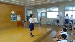 17日(月)にクラスで自然教室の新聞発表会を行いました。そこでクラスの代表に選ばれた3人が、今日の朝集会で学年全体の前でもう一度発表してくれました。