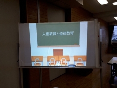 授業後に教職員が集まり研修会を行い、道徳授業について意見交換や公開授業の振り返り等を話し合いました。四日市市教育委員会人権・同和教育家より米川課付主幹に来ていただき、専門的視点からご助言をいただきました。今後の道徳教科化にむけて、更なる指導力の向上に努めていきます。