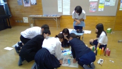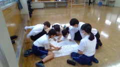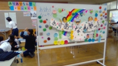 雨の影響でじめじめと湿度の高いワークスペースで、各クラス模造紙を広げて描いています。はやいクラスは絵具を塗り始めています。さて、どんなカラフルな学級目標が仕上がってくるのでしょうか……。
