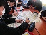 2年生では総合的な学習の時間を利用して進路学習を行っています。自分の進学したい高校のことを調べ、その後、北勢地区にある高校を各班で分担して調べ、模造紙にまとめました。この取り組みを通じて、将来への意欲につなげていきましょう。