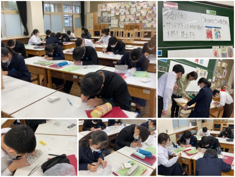 ところ変わって美術室では、3年生が「サンドブラスト」の製作中。