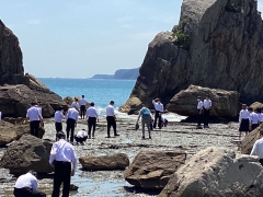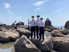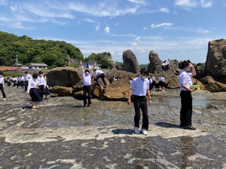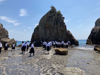 みんな岩の上を渡って、波打ち際へと…