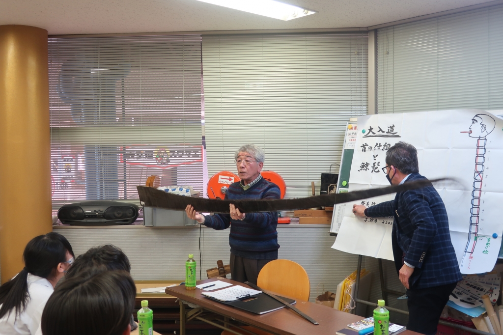 「御諏訪神輿保存会」と「大入道山車保存会」の方々に四日市祭りや神輿、大入道の歴史を教えていただきました。