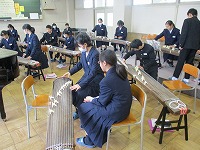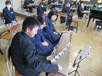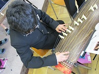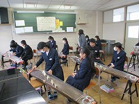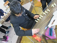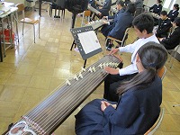 一年生音楽、「箏」の授業です。弾き方を練習し,みんなで日本の伝統的な歌曲「さくら」を演奏しました。とてもいい音色です。