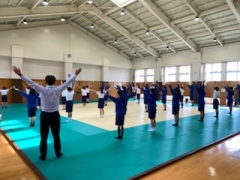 1年生の体育の授業です。担任の先生も一緒にラジオ体操をしていますよ♪