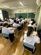 2年生の国語の授業です。枕草子を読み解いています。生徒の学びを深める発問の仕方やポイントの押さえ方を、しっかりメモをとっていました。