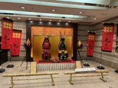 立派なホテルに宿泊です。フロントには鎧兜が飾られています。