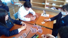 楽しそうにトランプをしています。頭にトランプくっつけて楽しそう☺