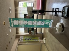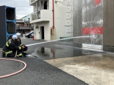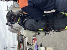 消防署では、実際に消防士さんが着用する服を着させてもらいました。重い服を身につけての放水作業に、生徒はヘトヘトでした。本物の消防士さんたちの体力、すごいです。