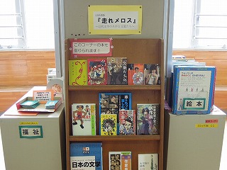 これ以外にも、2年生国語で学習している太宰治の「走れメロス」に関連して、近代日本の文豪たちが書いた本のコーナーや、図書委員がお薦めの本のコーナーも設置されています。ちょっとした時間に読書することは、教養が豊かになりますね。