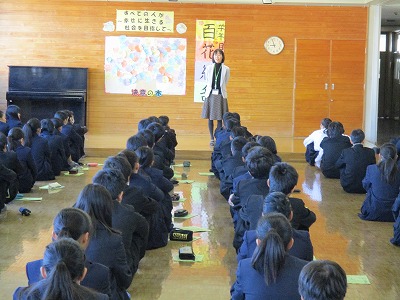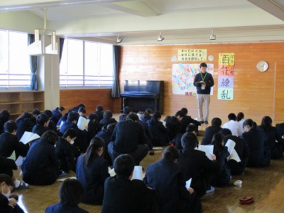 2年生の学年集会の様子です。冬休み中の学習と生活についての話がありました。毎日コツコツ勉強することが来年の受験につながってきます。実践してみましょう。安全に気をつけて楽しい冬休みにしてください!