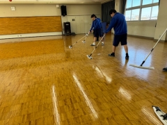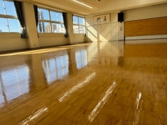 練習後は、日ごろ使っている多目的ホールをきれいにするため、ワックスがけをしました。みんなで協力し、手際良く進めることができました。