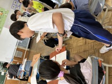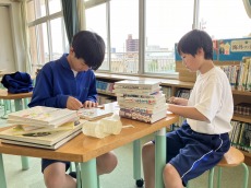 中部西小学校では、学校図書のお仕事も体験させてもらっています。担当の方からは「1人ですると、かなり時間がかかる作業なので、手伝ってもらってすごく助かります」と感謝の言葉をいただきました。小学生と3日間過ごしてきた2人は、だいぶ慣れてきたようです。
