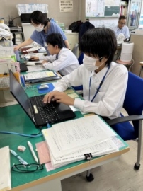中部地区市民センターでは、昨日の打ち合わせを受けて、夏休みにある講座のチラシ作りをしていました。担当の人に教わりながら、どんなチラシができるのか楽しみです。体験も残り数時間となりましたが、頑張ってください!
