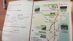 英語の授業。四日市から各方面への行き方を英語で説明します。