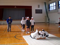 ほとんどの児童が初めてということで、まずはじめに柔道についての質問、自分の身の守り方などをウォーミングアップとして行いました。