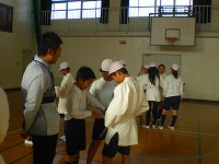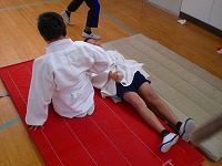 その後、中学校から持って行った柔道着を着てみました。うつ伏せからの返し返されゲームや抑え込みなどを体験しました。