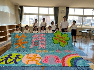 完成した学年目標と一足お先に記念撮影。みんないい笑顔です。