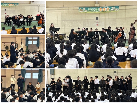 各楽器の紹介(ソロ演奏)。質問コーナー、生徒参加の演奏など、趣向を凝らしたプログラム。思わず、前のめりになって聞く中部中生。