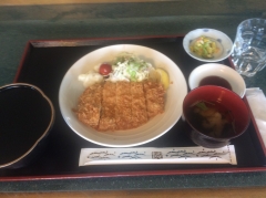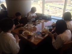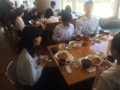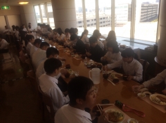 窓からの眺めの良い会場で昼食です。とんかつ御前、ご飯おかわり付きです。体調の悪い生徒もおらず、みんな元気で食べています。