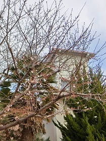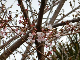 正門横の桜もほころびはじめ