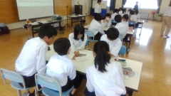 まず、先日から観ている動画の出演者の魅力を小グループで交流し合い、それぞれのグループで「かっこいい大人の魅力」について考え、3つのキーワードを「“かっこいい大人”魅力発見シート」にまとめました。
