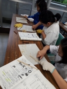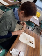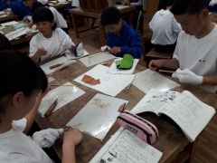 小刀を使い、材料である竹を少しずつ削ることで箸の形へと近づけました。細くすることに手間取ったり、持ち手の「節」の部分を工夫したり、力の加減や完成をイメージすることで良い集中が出来ていたと思います。鶴の箸袋やカニの箸置きに苦戦しながらも、黙々と取り組むことができました。