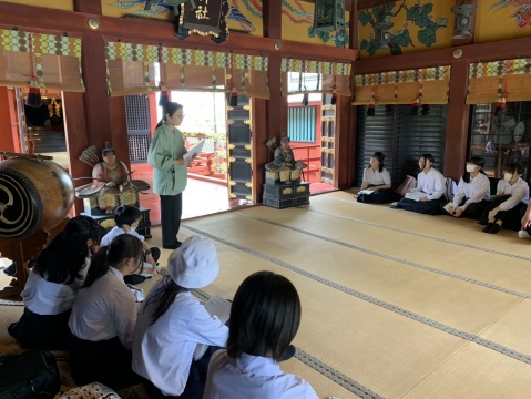 浅草神社の歴史やお祭りについて話を聞いています。