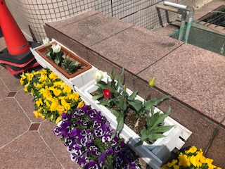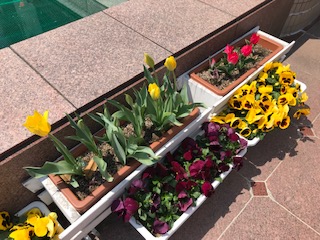 ます。写真は遠景なのであまりよくわかりませんが,花壇にはノースポール,なでしこ,金魚草,アリッサム,ルピナス,ネメシア,オルレア,イベリス,そして夏の花のペチュニアと9種類もの花が咲いています。また,玄関の両脇にある生活環境部のプランターのパンジーやチューリップ,プリムラはもちろんのこと,池の鯉も皆さんの登校を心待ちにしているようです。登校した際にはぜひ見てください。