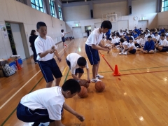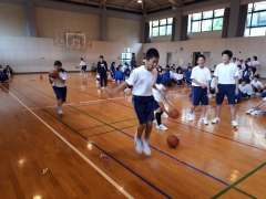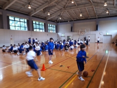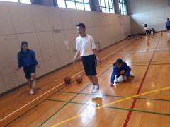 ルール①バスケットボールをドリブルしながら、体育館を1周します。