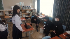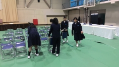 体育館では、二年生のクラスが中心となって会場の片付けを進めています。式の余韻が残る中、一つひとつの椅子や用具を丁寧に運びながら、黙々と作業に取り組む姿がありました。先輩たちが旅立った後、その場をしっかりと整えようとする二年生の姿から、次の中部中を支えていこうとする気持ちも感じられました。
