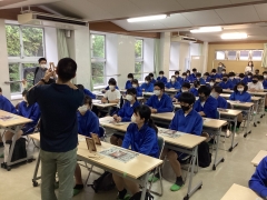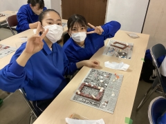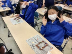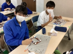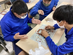 説明聞いて、2、3組「貝殻フォトフレームづくり」スタートです!