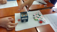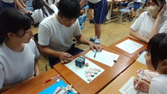 ペットボトルのフタを指ではじきます。その速さに対し、10個のペットボトルのフタがいくつ動くかという実験をしました。