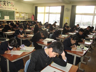 今日の2年生の帰り学活前の10分間の補充学習では、言語活動の充実の取り組みとして、縮約に取り組みました。内容は小学校の教科書レベルの短い文ですが、65字以内で筆者のもっとも言いたいことをまとめるという課題でした。「むずかしかった」という声もありましたが、