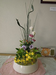 今回は、「エニシダ、トルコキキョウ、オンシジューム、ヒペリカム」を活けていただきました。毎回違った趣の作品で、目を楽しませてもらっています。誠にありがとうございます。