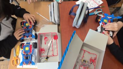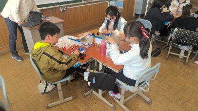 5年 図工「『ペーパーファン』をつくろう」の学習。デザインした形に紙を何枚も切って、貼り合わせて張り合わせて作ります。