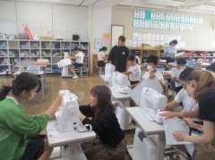 家庭では家庭アシスタントさんの協力も得ながら、ナップザックの両サイドをミシンで縫う作業学習をしました。そして、体育で行っている運動会の練習では、