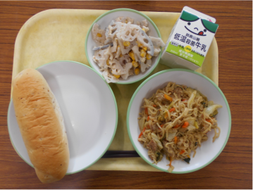 小型玄米パン 牛乳 やきそば れんこんサラダでした。