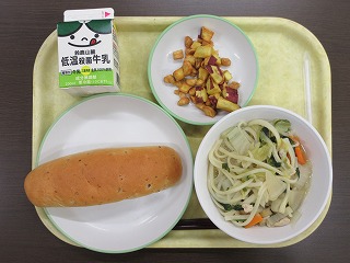 小型玄米パン、牛乳、しのだうどん、さつまビーンズでした。