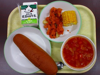 黒糖パン、牛乳、いかのスパイシーあげ、とうもろこし、ミネストローネでした。