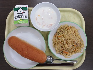小型玄米パン、牛乳、和風スパゲッティ、フルーツヨーグルトでした。
