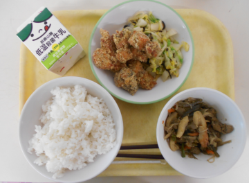米飯、牛乳、鶏肉の茶らあげ、たくあんあえ、五目きんぴらでした。